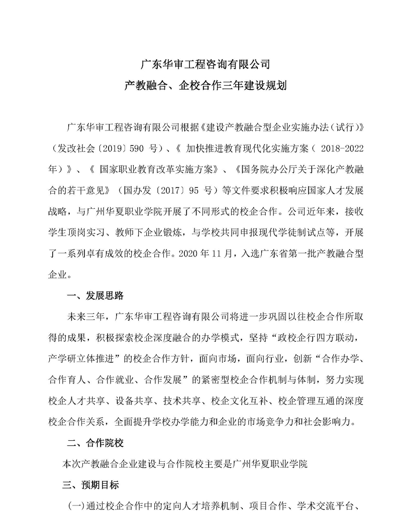 廣東華審工程咨詢有限公司 產(chǎn)教融合、企校合作三年建設規(guī)劃
