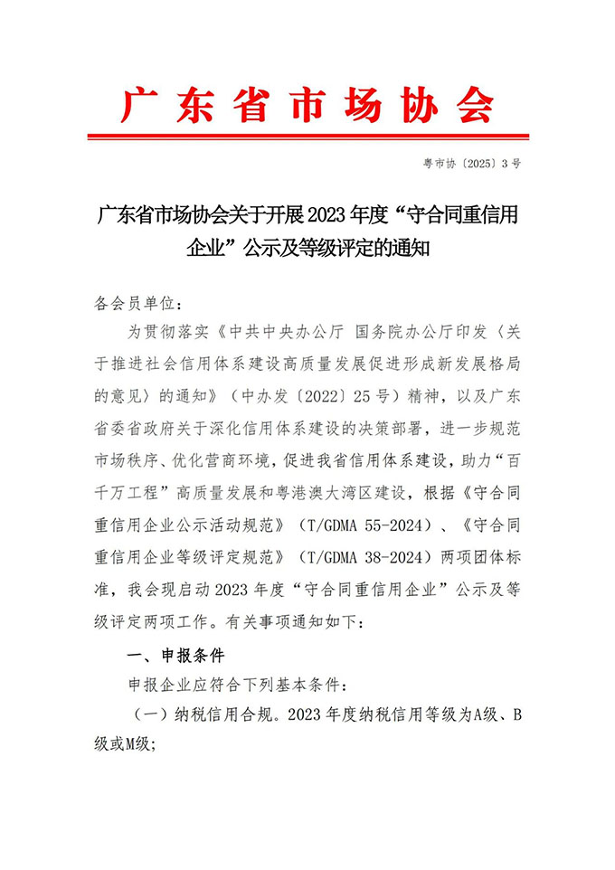 廣東省市場協(xié)會關(guān)于開展2023年度“守合同重信用企業(yè)”公示及等級評定的通知
