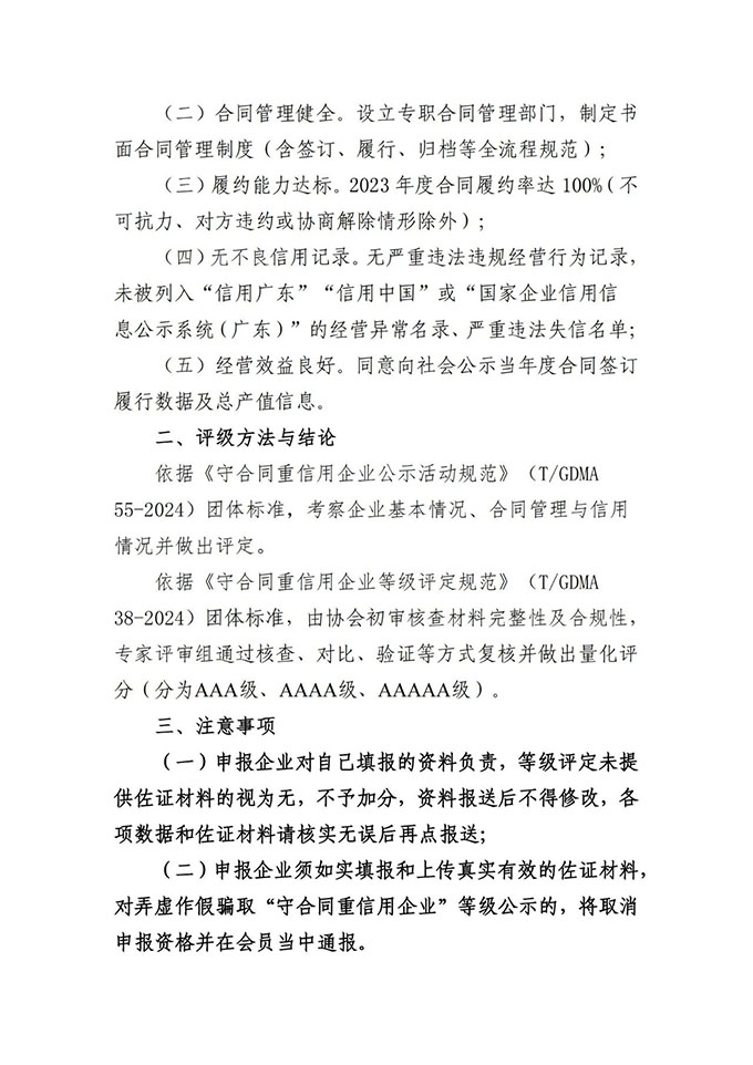 為貫徹落實(shí)《中共中央辦公廳 國務(wù)院辦公廳印發(fā)〈關(guān)于推進(jìn)社會信用體系建設(shè)高質(zhì)量發(fā)展促進(jìn)形成新發(fā)展格局的意見〉的通知》(中辦發(fā)〔2022〕25號)精神,以及廣東省委省政府關(guān)于深化信用體系建設(shè)的決策部署,進(jìn)一步規(guī)范市場秩序、優(yōu)化營商環(huán)境,促進(jìn)我省信用體系建設(shè),助力“百千萬工程”高質(zhì)量發(fā)展和粵港澳大灣區(qū)建設(shè),根據(jù)《守合同重信用企業(yè)公示活動規(guī)范》(T/GDMA 55-2024)、《守合同重信用企業(yè)等級評定規(guī)范》(T/GDMA 38-2024)兩項(xiàng)團(tuán)體標(biāo)準(zhǔn),我會現(xiàn)啟動2023年度“守合同重信用企業(yè)”公示及等級評定兩項(xiàng)工作。有關(guān)事項(xiàng)通知如下: